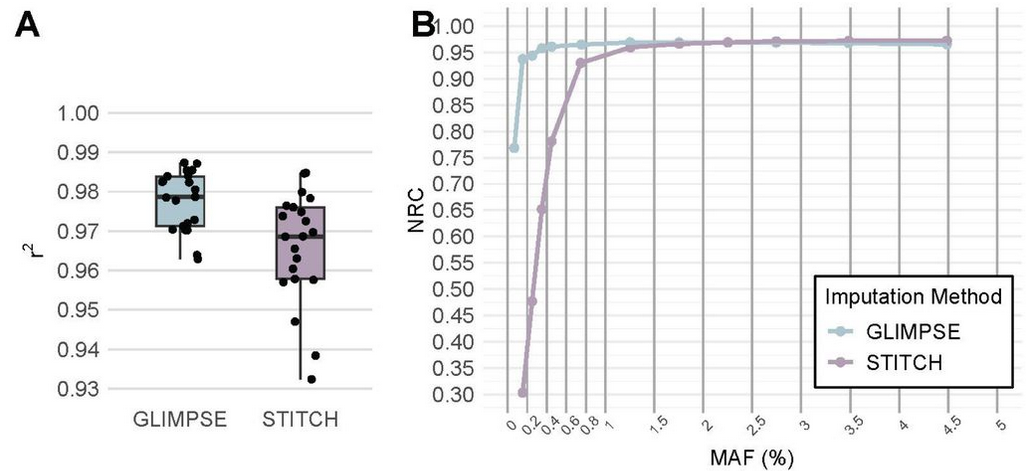 Les graphique ci-dessus représent l’efficassité des imputation de génotype, pour la figure A la métrique mesurée est la correlation de Pearson au carré \(r^2\). Calculé entre les donnée séquencer en haute qualitée (référence) et les donnée imputé.