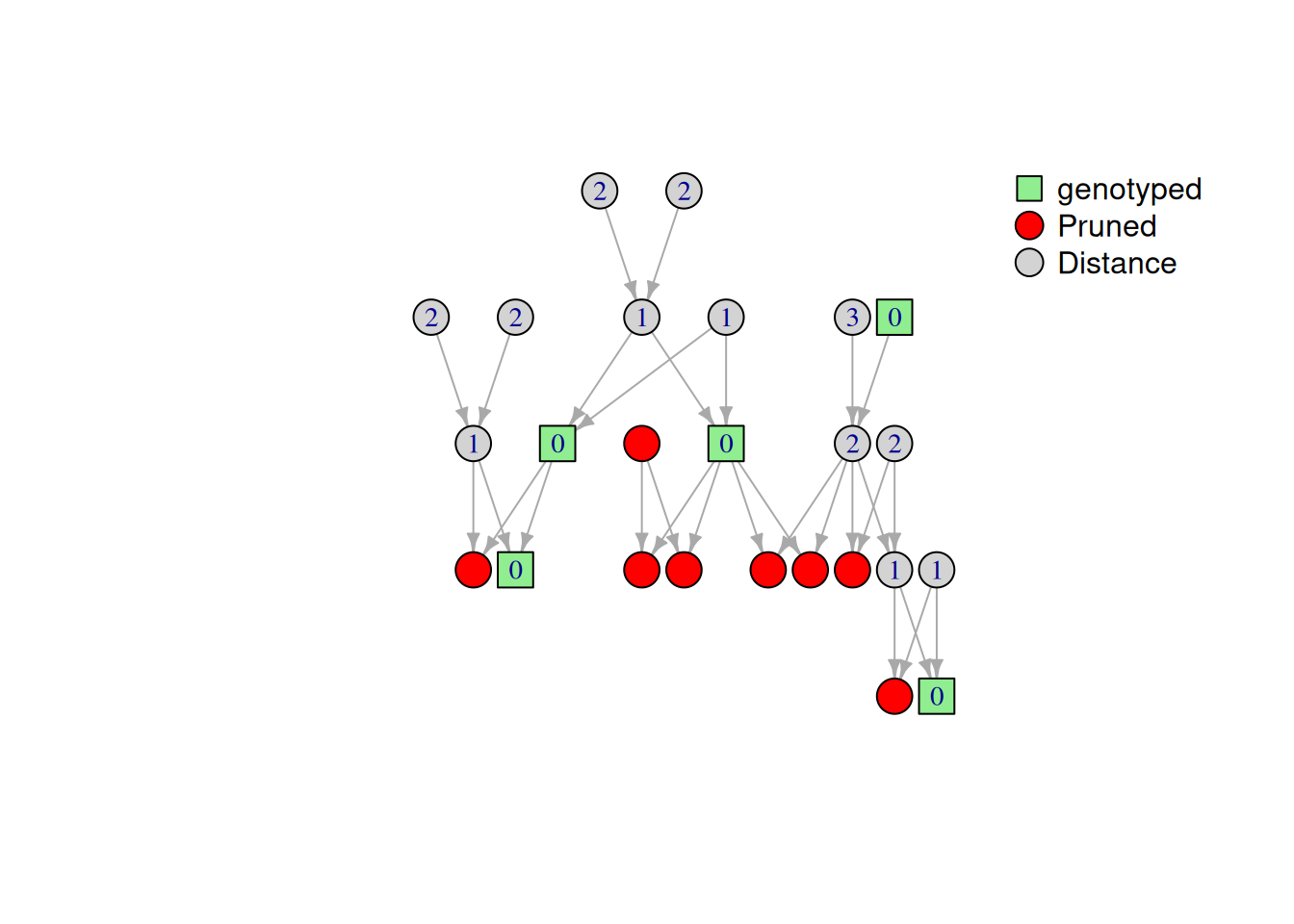 Dès lors ce qu’on manipule des réseaux de grande taille il arrive souvent de ne pas pouvoir valorisé toute l’information. par exemple, dans le cadre du peeling, si un sous-graphe entier du pédigrée n’est pas génotypée, alors elle n’apporte aucune information génétique, de plus l’imputation de génotype de ces individus risque d’étre très mauvaise et, par conséquent, de faire baisser la vraisemblance globale du modele. Pour pallié ce probleme un pédigré doit étre “Pruné”, cette étape permet de se séparer des “branches” jugé inutile, ou du moins inutilisable.