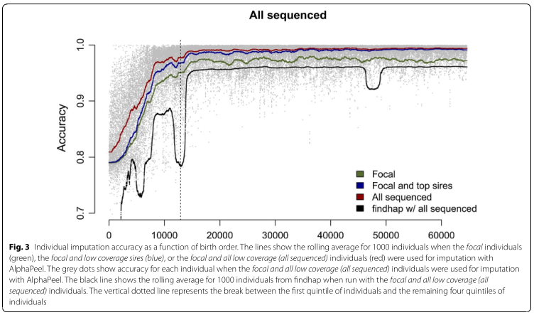 Le hybrid peeling semble avoir de bon rendements et permet avec une bonne précision d’imputer le génotype d’individus non séquencer (ceux génotyper par chi array??)